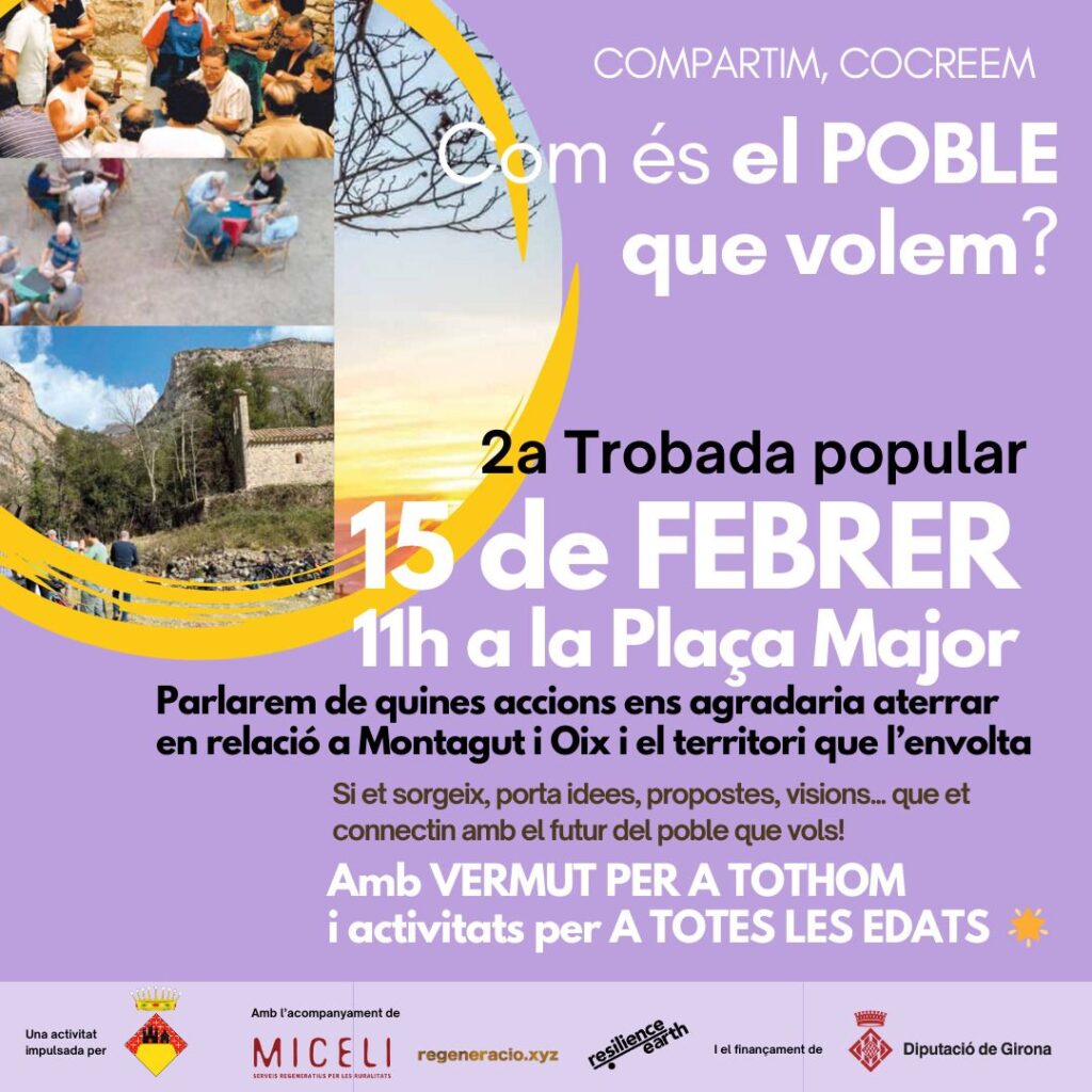 El pròxim 15 de febrer a les 11h ens trobem a la Plaça Major de Montagut per parlar sobre les accions que ens agradaria impulsar per al futur del nostre poble i territori. 🌱🏡
