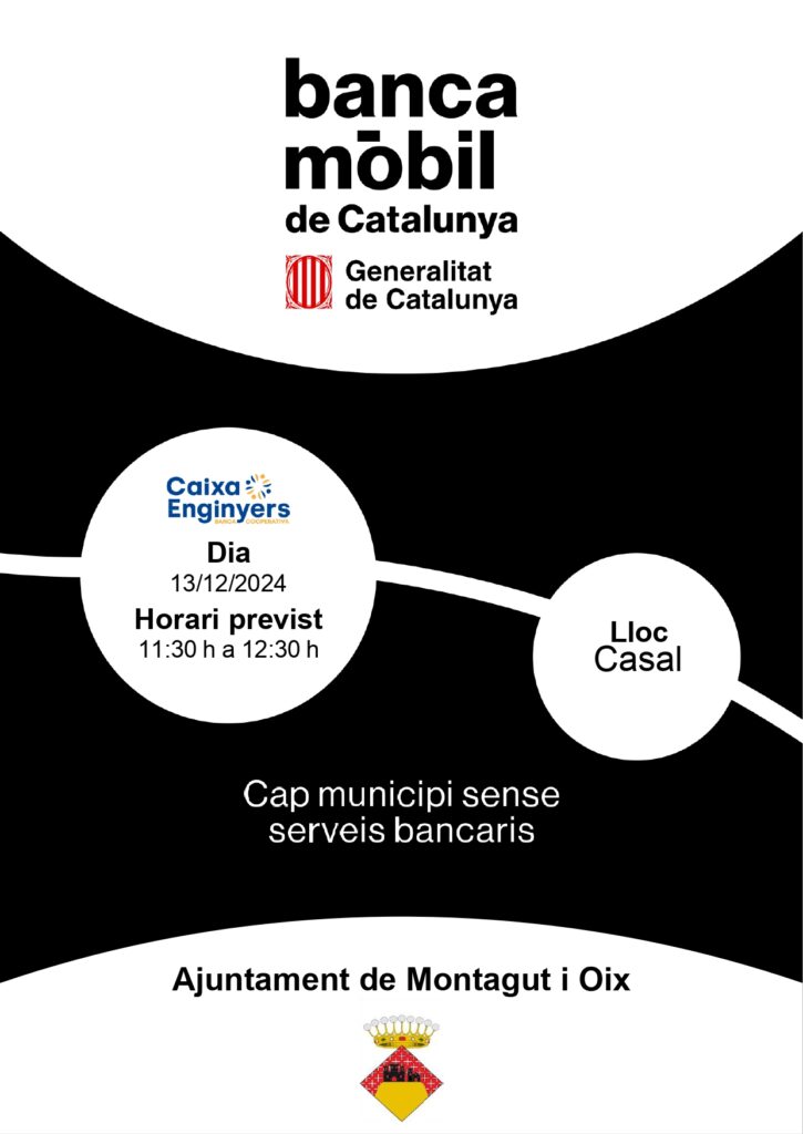 Agenda BANCA MÒBIL Divendres, 13 de desembre | Casal . De 11:30 h a 12:30 h ℹ️ INFO BANCA MÒBIL A MONTAGUT. 🗓️ Divendres, 13 de desembre🕧 De 11:30 a 12:30➡️ CASAL de Montagut < Entrada AnteriorEntrada Posterior >