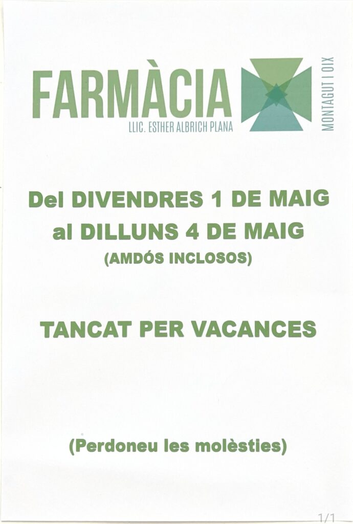 Agenda Farmàcia tancada per vacances. 27/04/2026 Del divendres 1 de maig al dilluns 4 de maig. < Entrada Anterior